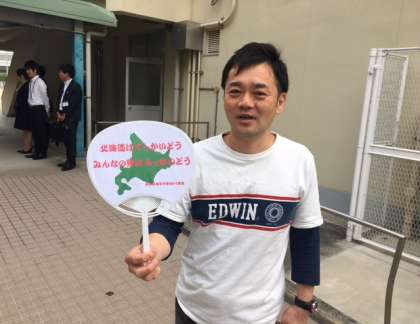 下の写真は、塩井先生から後藤主任にプレゼントされた修学旅行のスローガンが印刷された特製うちわです。