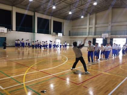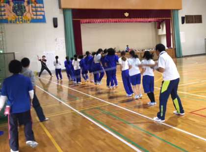 男子よりも女子の方が人数も少なく続いています。大縄を回す先生もかなり大変そうです。