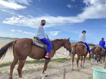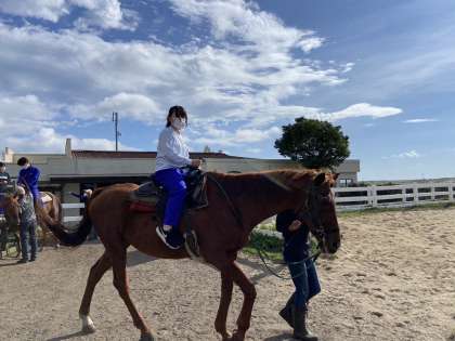 初めての乗馬に怖がっていましたが、楽しんでいます。