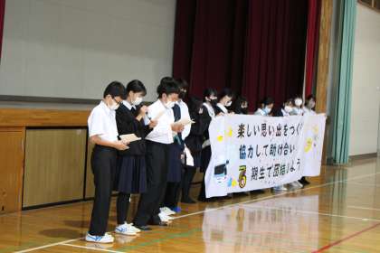続いて、1年生宿泊訓練実行委員からスローガン旗のお披露目がありました。明日から2日間、貝塚に出かけます。