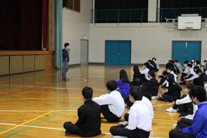 最後に、生徒指導主事 上原先生からスマホの使い方についてお話がありました。「いい学校ってなんだろう」という問いかけから始まり、トラブルが続いていること、なんでもかんでも禁止にすることはできるが それでいいのか、「いい学校とは何か考えてください」というお話でした。みなさん、しっかり考えてくださいね。