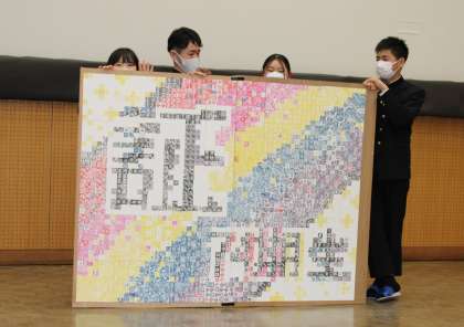 ・卒業制作『証』が披露されました。全員の名前の判子でできています。美術の授業(篆刻)で作成した印章です。ステキな作品ができました。