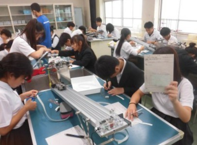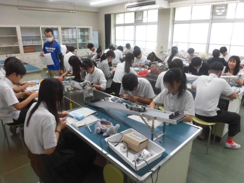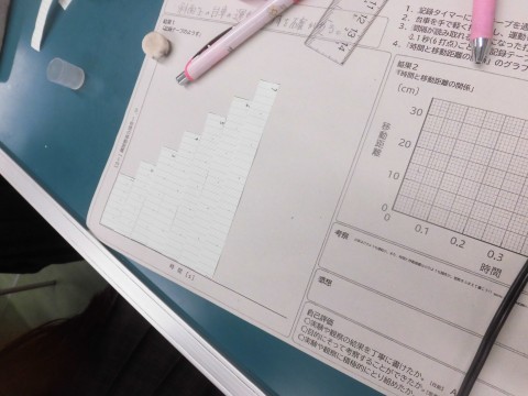 記録タイマーで定時的に「・」が打たれたものを、グループ内で分業して黙々と実験作業を進めていっていました。