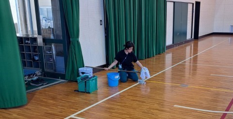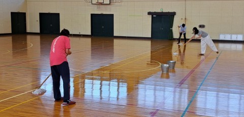 中間テスト初日、昼から数人の教師で、体育館のワックスがけを行っていました。