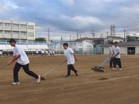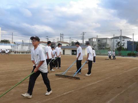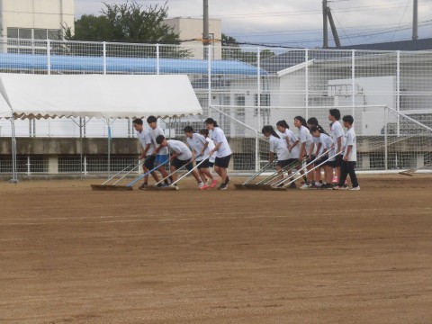 明日の午後が雨の予報で、準備がなかなかできなさそうなので、予行が終わった午後に陸上部と野球部がしっかり時間をかけてあさっての本番に向けた準備をしてくれました。本当によくがんばってくれていて、その姿を見た多くの先生が「すばらしいなぁ」と思ったことでしょう。校長先生はみんなが準備してくれている姿を、ずっとグラウンドで見守っていました(ご自身もトンボをかけたりしながら)。