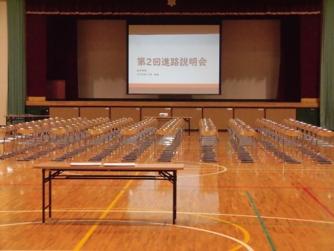 昼休みに卓球部が進路説明会の準備をしてくれました。縦横のイスの間隔がピシッとそろった会場を設営してくれました。