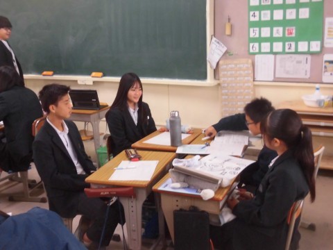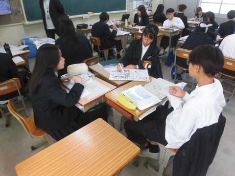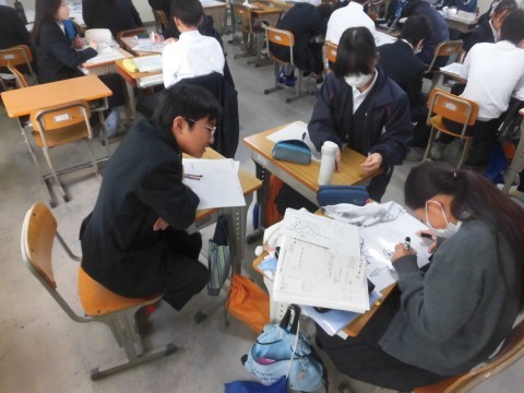 台風が通る軌道について、各班で考えていました。次の時間に各班1名ずつに発表してもらうそうです。
