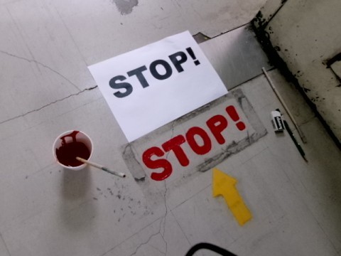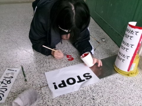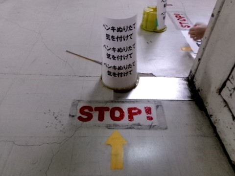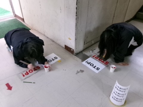 放課後、美術部のみなさんが 危険な曲がり角に STOP と書いてくれました。