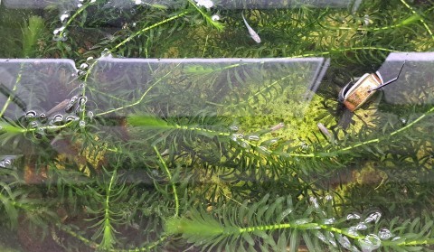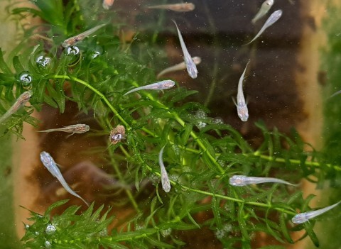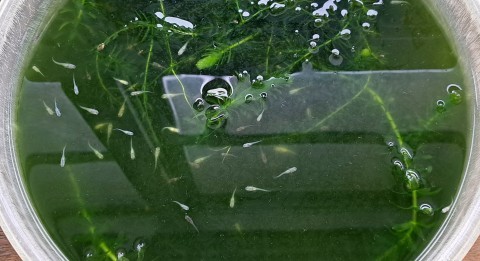 真ん中の画像をよく見ると半透明の卵が見えるかと思います。体の大きい成魚と卵はいっしょにしておくことができないそうで、メダカたちをお引越しさせながら理科の先生が飼育してくれています。