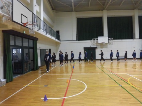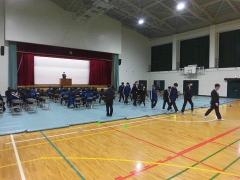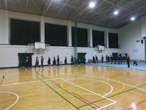 卒様式の練習(退場)をしていました(画像は2組・4組)。各クラス生徒席の後ろに保護者席があり、入場は各クラス列の右側を、退場は各クラス列の左側を歩いて通ります。