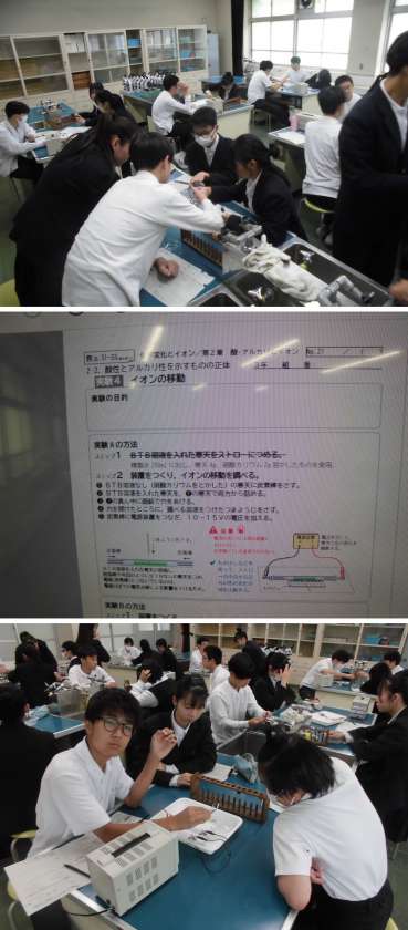薬品を使って「イオンの移動」の実験を行っていました。「薬品を取り扱っている」雰囲気の中、落ち着いて慎重に実験を行っていました。