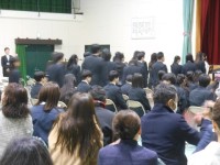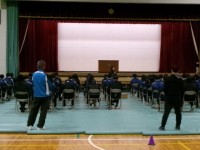 卒様式の練習(退場)をしていました(画像は2組・4組)。各クラス生徒席の後ろに保...