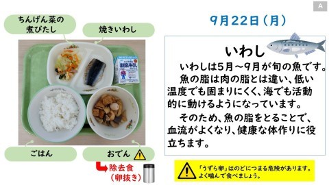 今日の給食は、「ごはん・牛乳・おでん・焼きいわし・ちんげん菜の煮びたし」です。