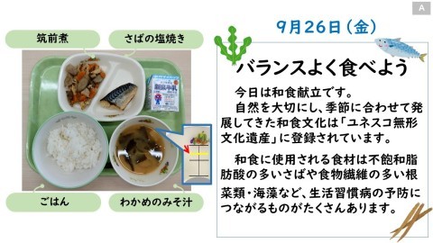 今日の給食は、「ごはん・牛乳・さばの塩焼き・筑前煮・わかめのみそ汁」です。