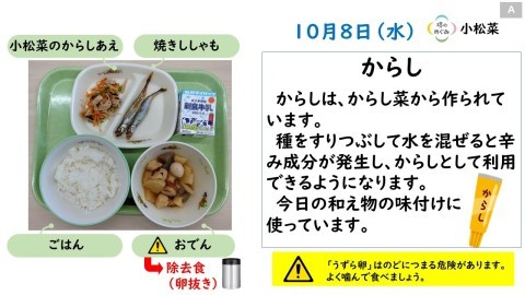 今日の給食は、「ごはん・牛乳・おでん・焼きししゃも・小松菜のからし和え」です。