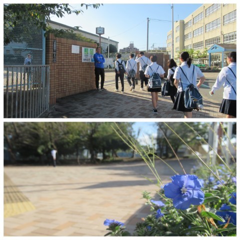 本日の朝の登校風景です。本日は朝から青空が広がる清々しい気候となっています。「おはようございます!」と元気な挨拶で,とても気持ちの良い朝となりました。ありがとうございます。本日もよろしくお願いいたします。