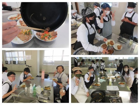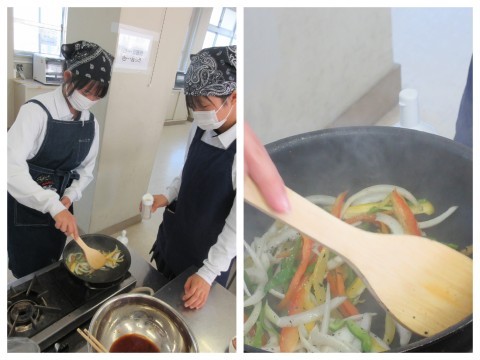 本日の2年生の家庭科の授業です。調理実習「豚肉のしょうが焼き」でした。薄切りの豚肉に,みりん,しょうが,醤油を入れて混ぜ,油をひいたフライパンで焼きました。醤油としょうがの良い香りが調理室を満たしていました。パプリカ・ピーマン・たまねぎの色どりしょうが焼きをより美味しいものにしてくれていました。生徒らは,できた料理を笑顔で美味しそうに食べていました!みんなで「いただきます!」