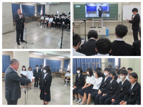 本日,「令和7年度 後期生徒会」の認証式を行いました。生徒会役員および各種委員会の委員長に認証状を渡し,正式に生徒会が組織されました。「子どもたちの主体性を育む学校」という教育目標のもと,生徒主体の学校づくりのため生徒会活動を活発にしたいと思っております。自分の意思で立候補してくれました。頑張ってくてださい!ありがとうございます。