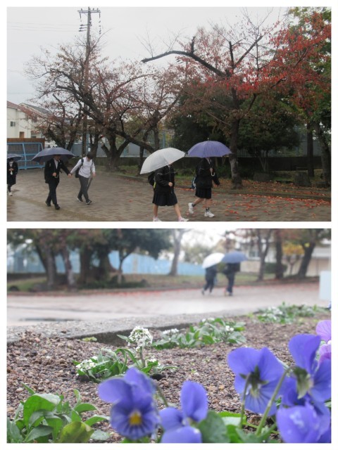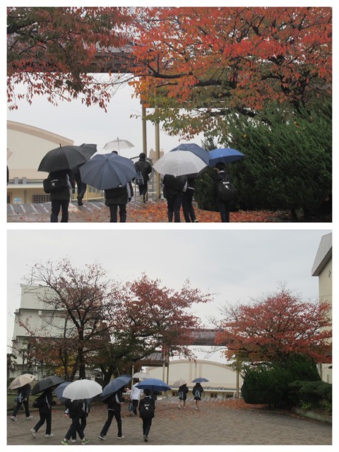 おはようございます。本日の朝の登校風景です。本日は朝から小雨が降り,肌寒い気候となっています。桜の葉も色づき,本格的な紅葉で晩秋という中の登校となりました。本日は3年生進路懇談の最終日です。また,今週は定期テストもあります。安全・健康で今週も教育活動を進めてまいります。どうぞよろしくお願いいたします。