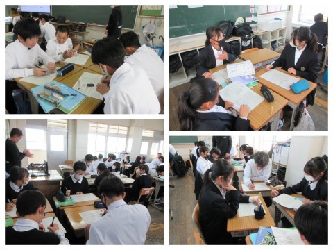 本日の1年生の午後の授業の英語です。内容は「浜中クローバー」で学び合いを深めて学習していました。食べ物,果物,スポーツ,楽器などの英単語について,「あなたは~が好きですか?」など,様々な英文に活用して学び進めていました。積極的に「読み」「書き」「話し」「聞いて」いました。