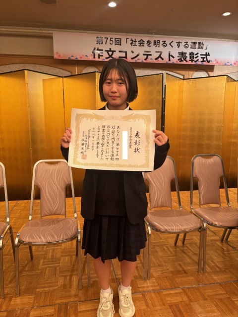第75回「社会を明るくする運動」作文コンテストで、本校2年生の生徒が見事「BBS会会長賞」をいただき、その表彰式に参加させていただきました。入賞した作文の題名は、『 「人」との関わりで変えられる明るい未来 』です。犯罪や非行を犯してしまう人も、私たちと同じ「人」であるという視点から物事が考えられています。お互いを尊重しあえる関係が明るい社会への第一歩なんだと感じさせられる素晴らしい作文でした。図書室に入賞作文集の冊子を置いておきますから、ぜひ一度読んでみてください。