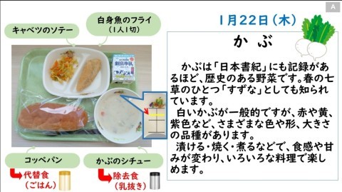 今日の給食は、「コッペパン・牛乳・白身魚のフライ・キャベツのソテー・かぶのシチュー」です。