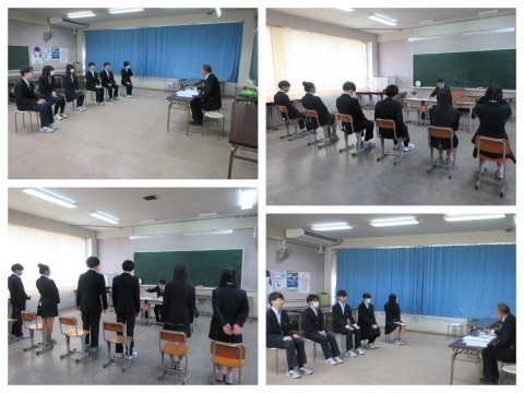 本日,3年生は高校受験に向けて「面接練習」を行いました。すべての生徒が高校受験で面接があるわけではありませんが,これからの人生でいわゆる「面接」を受ける機会は必ずやってきます。「なぜ希望したのですか?」「志望動機は?」「中学校で頑張ってきたことや,一番思い出に残ってることは?」「高校に入って頑張りたいことは?」などの質問がありました。もうあと3か月後には新たな進路に向けて進みだします。面接練習をしながら,進路に向けて頑張る気持ちを高めました。応援お願いいたします!