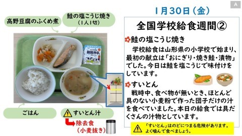 今日の給食は、「ごはん・牛乳・鮭の塩こうじ焼き・高野豆腐のふくめ煮・すいとん汁」です。