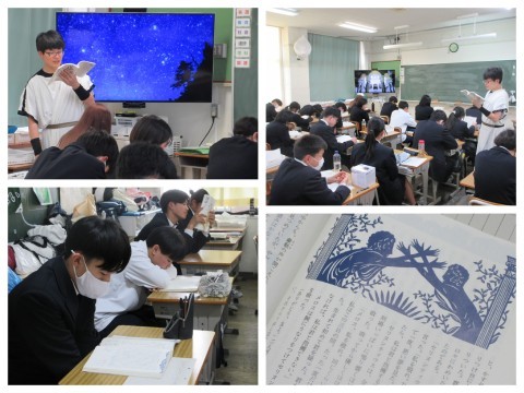 2年生の国語の授業です。テーマは「走れメロス」でした。「走れメロス」は友情の尊さ,人間の信頼をめぐる葛藤,弱さを抱えながらも前に進む人間の姿を描く 「友情物語」として有名ですが、信頼とは何か?人はどう変わるのか?という哲学的テーマも深く考えるポイントになっています。授業では導入で授業者の先生が本文を読み,内容をしっかりと理解しました。