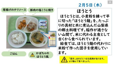 今日の給食は、「ごはん・牛乳・豚肉の塩こうじ焼き・厚揚げのチリソース・かぼちゃのほうとう風」です。
