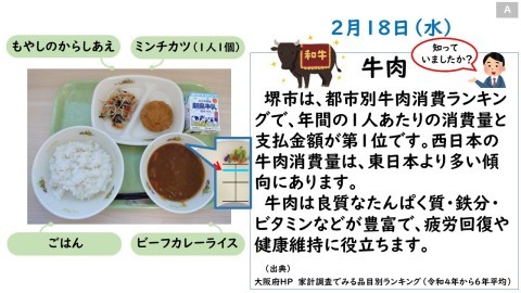 今日の給食は、「ごはん・牛乳・ビーフカレーライス・ミンチカツ・もやしのからしあえ」です。