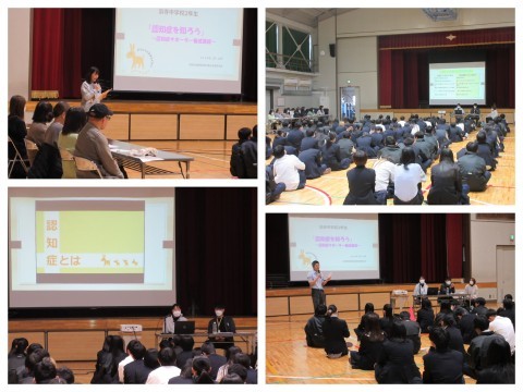 本日2年生の4時間目は「認知症サポーター養成講座」でした。地域の民生委員の方々らに来ていただき,「認知症」に関する基礎知識や,そのような方々への対応方法などを学びました。一人ひとりの小さな優しさが大切だと感じました。ありがとうございました。