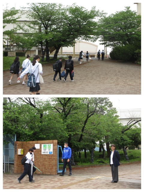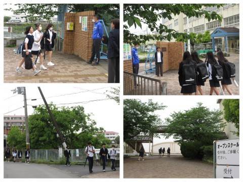おはようございます。朝の登校の様子です。本日は朝から昨日の雨がやみ,しっとりとした朝の気候となっています。週の初めですが,生徒らの「おはようございます!」という元気な挨拶でさわやかな朝のスタートとなりました。ありがとうございます。また,オープンスクールも本日実施しております。是非ご来校いただき,ご参観ください。