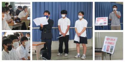終業式後の集会では生徒会役員の司会進行で、生徒指導主事の長田先生のお話「緊急車両に乗らない」「携帯やSNSの使い方を考えて」「自分を守る行動を」や各学年の代表の人による「1学期を振り返って」の報告がありました。
