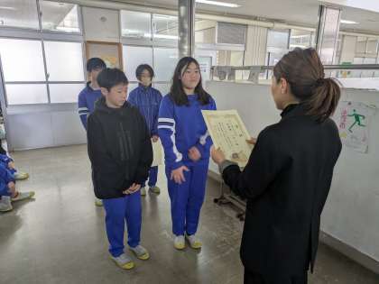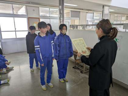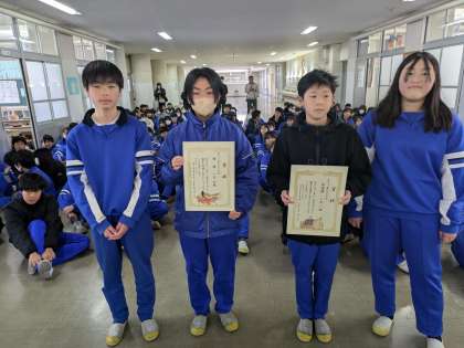 百人一首大会の表彰が行われました。 優勝 5組 準優勝 1組