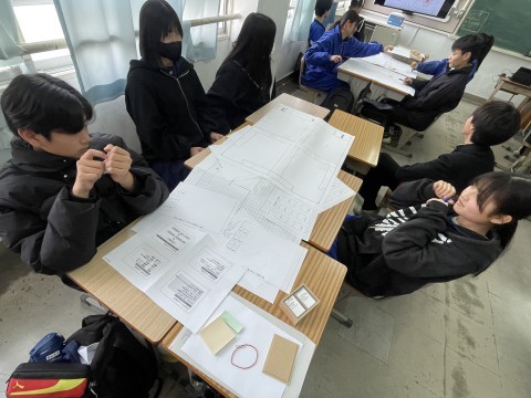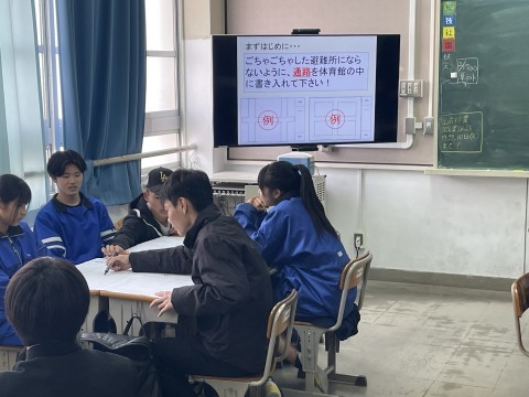 避難所を開設する際に、どのようにすれば多くの人が心地よく生活できるのかを考えながら避難所運営を疑似体験しています。「通路はどうしよう」「ペットがきたらどうしよう」など班で意見を出し合っていました。