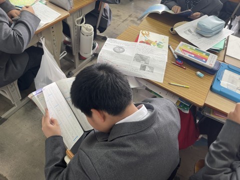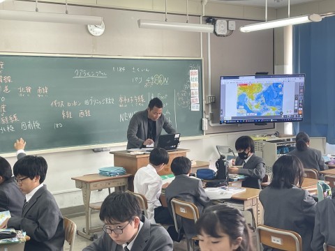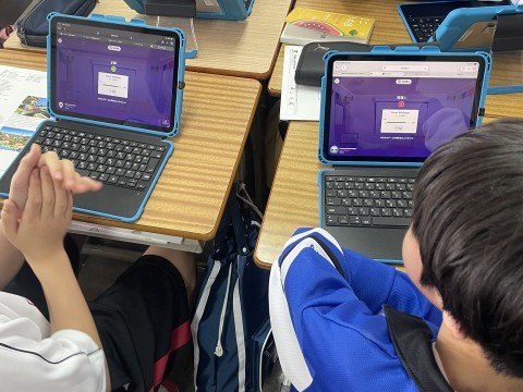 英語 カフートを使ってクイズ形式で授業が行われています。