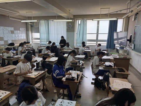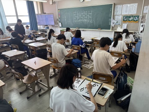 集中して書道をしています。