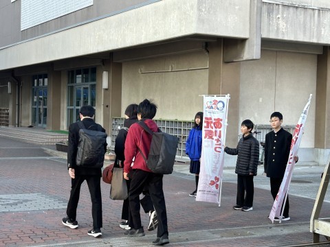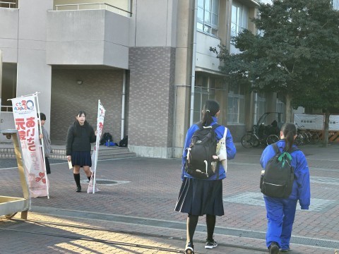 寒い朝ですが、生徒会役員が元気よく挨拶してくれています。