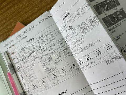 「誰が一番長く作れるか」作った糸をプリントに貼っていました。