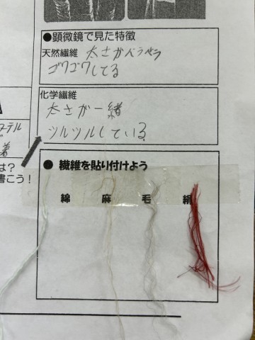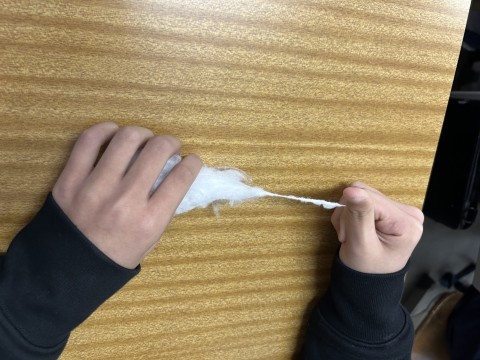 家庭科で天然繊維と化学繊維の特徴を確認して、綿から糸を作っていました。