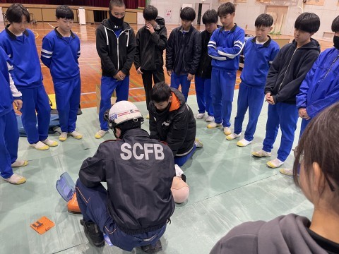 応急手当、心配蘇生について学んでいます。三角巾で腕をつる実践、胸骨圧迫の実践等、いつ必要になる現場に遭遇するかわかりませんので、基礎知識としてしっかり身体に叩き込んでほしいです。
