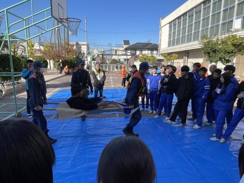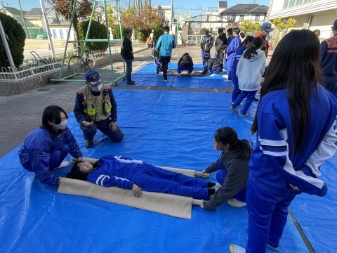 災害が発生した時の対応として、簡易担架の使い方や心肺蘇生法について実習をふまえて学習しています。