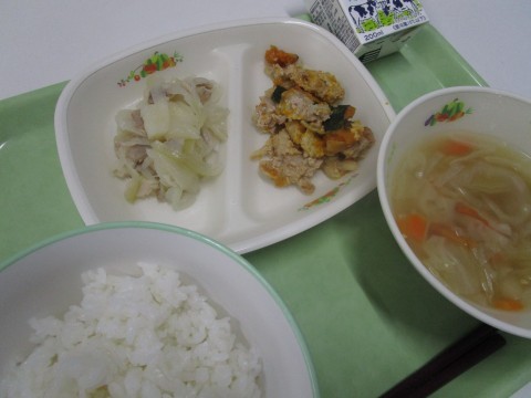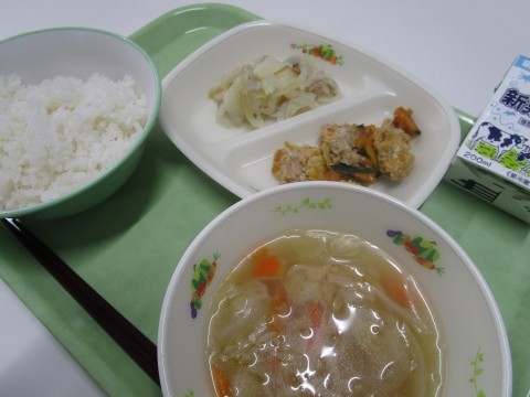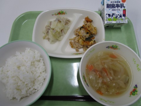 今日の給食は「ごはん、豚肉のバーベキューソース・ジャーマンポテト・コンソメスープ」です。