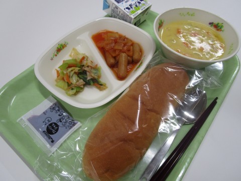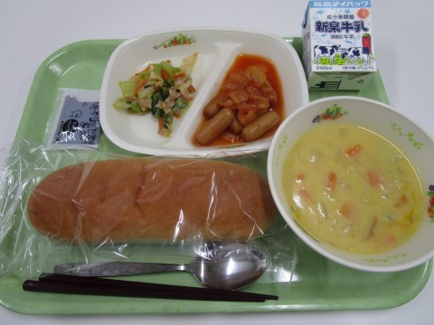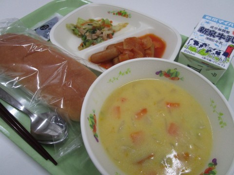 ■今日の給食 公開日 2025/10/16 更新日 2025/10/16 学校 今日の給食は「コッペパン・かぼちゃのシチュー・ウィンナーのケッチャップ煮・野菜サラダ・ブルーベリージャム」です。シチューの似合う季節になってきました。