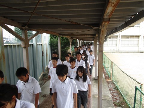 ■火災避難訓練 ~全校6時間目~ 公開日 2025/10/16 更新日 2025/10/16 学校 2階の調理室から出火した想定で、避難訓練を実施しました。天候が芳しくなく,体育館への避難となりましたが事前に各教室で担任の方から訓練の趣旨を話していたこともあったのか、スムーズな避難ができていました。いつ起こるかわからない火災や地震などの災害には、災害を想定した訓練を行うことが大切です。命に係わる重要な訓練です。避難後の講話もしっかりと聴くことができていました。やるときはやる。素晴らしい津久中生たちです。 +2