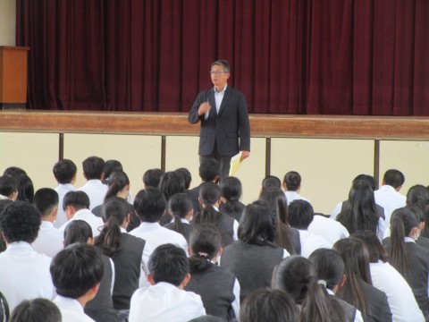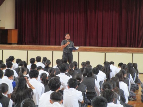 2階の調理室から出火した想定で、避難訓練を実施しました。天候が芳しくなく,体育館への避難となりましたが事前に各教室で担任の方から訓練の趣旨を話していたこともあったのか、スムーズな避難ができていました。