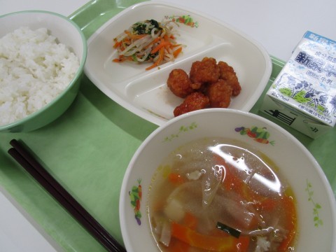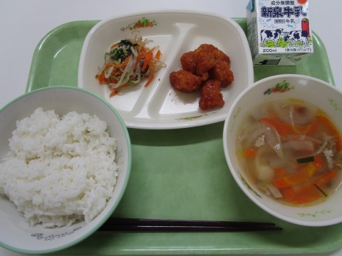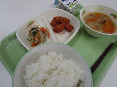 ■今日の給食 公開日 2025/10/21 更新日 2025/10/21 学校 今日の給食は「ごはん,ヤンニョムチキン・ほうれん草ナムル・中華スープ」です。韓国風のメニューになっています。ヤンニョムチキンも甘辛い味付けで,人気がありました。 ヤンニョムチキンは「양념치킨」のように書くようです。外国のメニューを通じて外国語に興味を持つのもアリかもしれないですね。