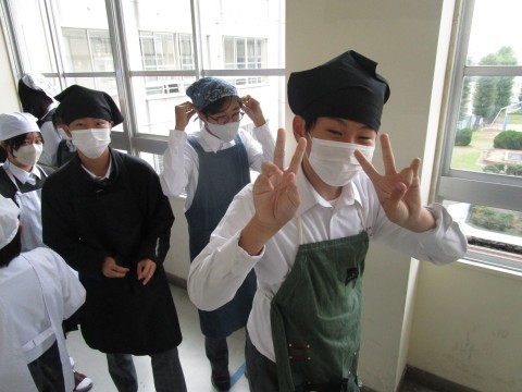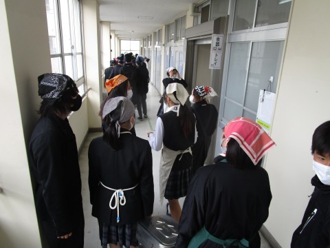 教室からヒョイと顔を出してくれた1年生女子。給食時間が始まるよ。