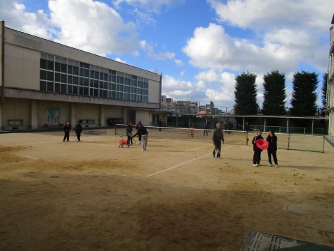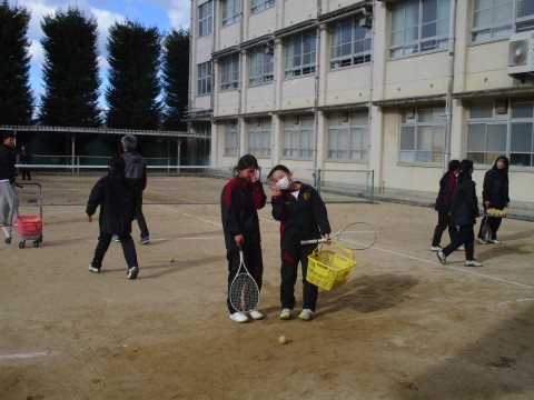冷たい風が時折突風もように吹くコンディションの中,こどもたちはテニスボールを追いかけています。